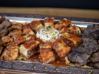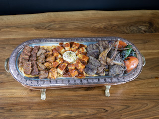 combination of chicken shish,chicken adana, lamb shish,lamb adana kebab,lamb chops, lamb shawarma,meatballs,beyti kebap,arugula salad,rice,bulgur and french fries